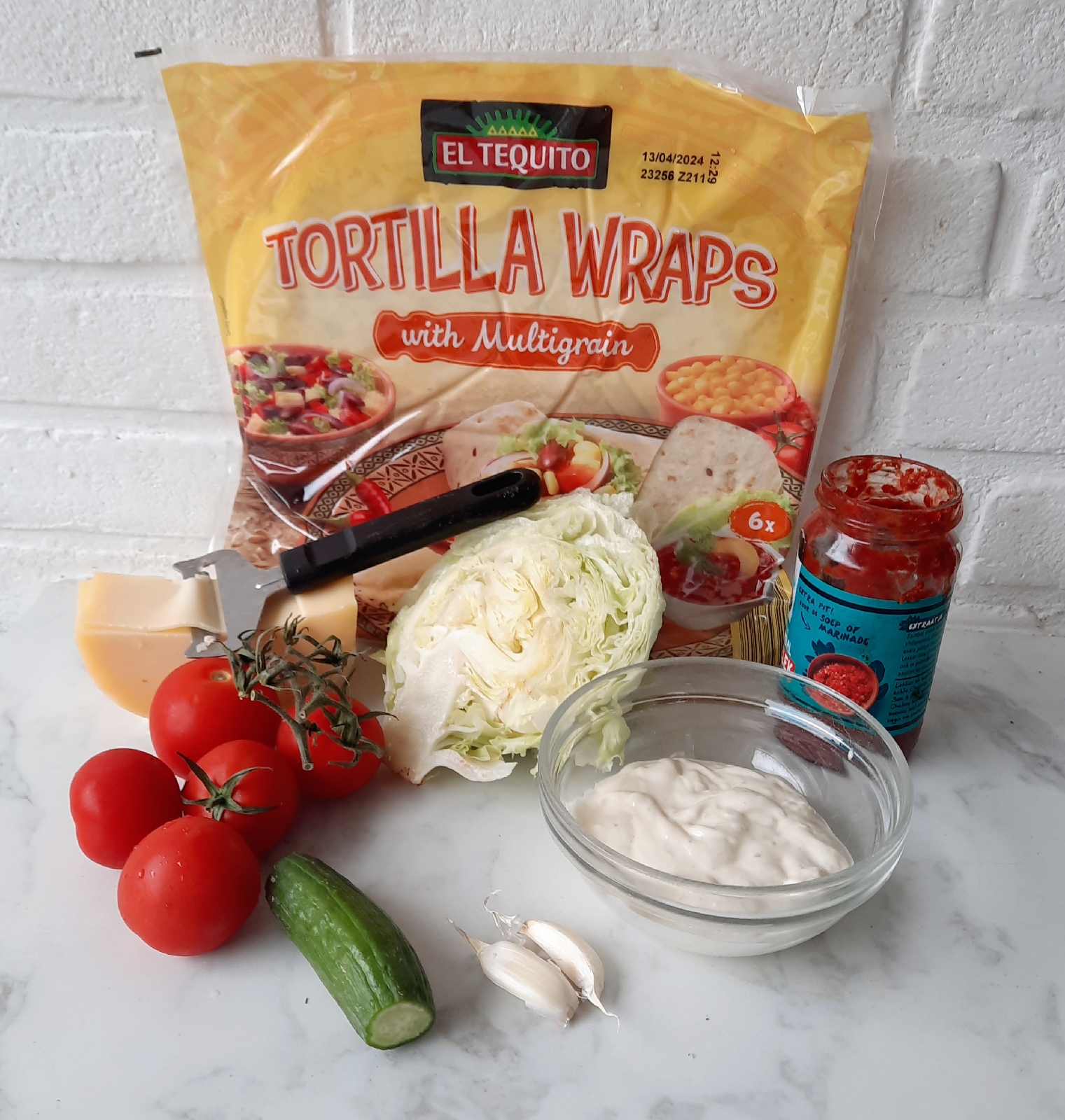 - 2 grote tortillawraps (mag volkoren of meergranen)